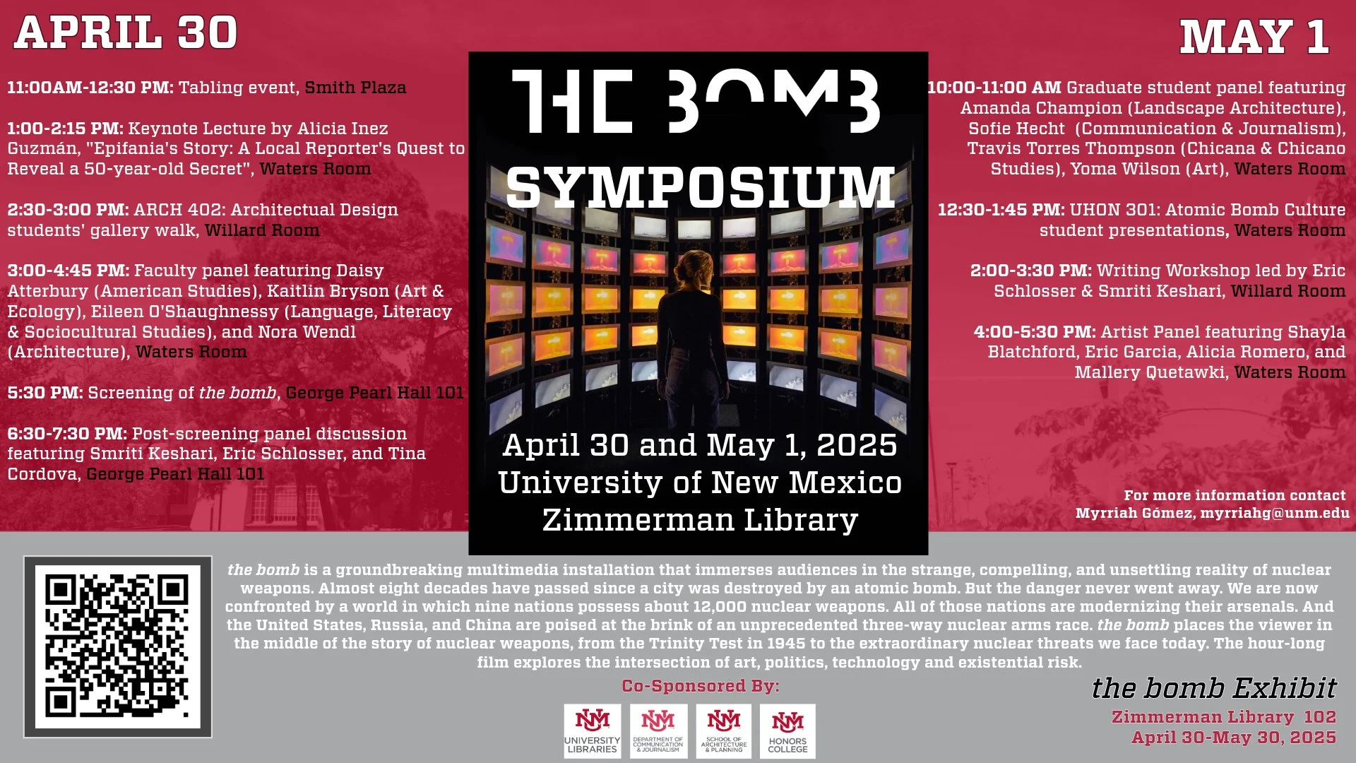 May 1, 2025: artist talk at the bomb symposium at University of New Mexico: https://honors.unm.edu/news/events/the-bomb.html